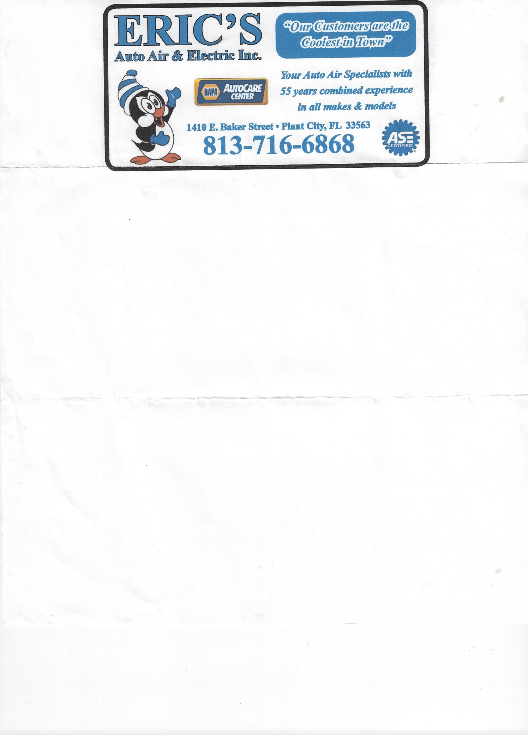 Eric’s Auto Air & Electric is accepting new customers. You can contact them by calling them at (813) 716-6868.